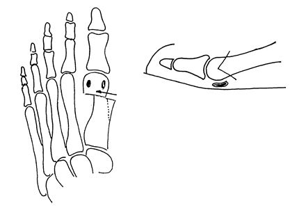Es wird eine keilförmige Osteotomie am Metatarsale I durchgeführt. Die Osteotomieenden werden verschoben und mit einem Stift, einer oder mehrer Schrauben fixiert.
