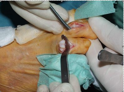 Bei der Hammerzehe wird das betroffene Genek versteift, um die Zehe zu strecken und gerade zu richten, so dass sie dann im Schuh nicht mehr stört und schmerzt.